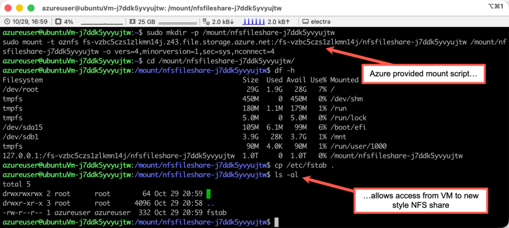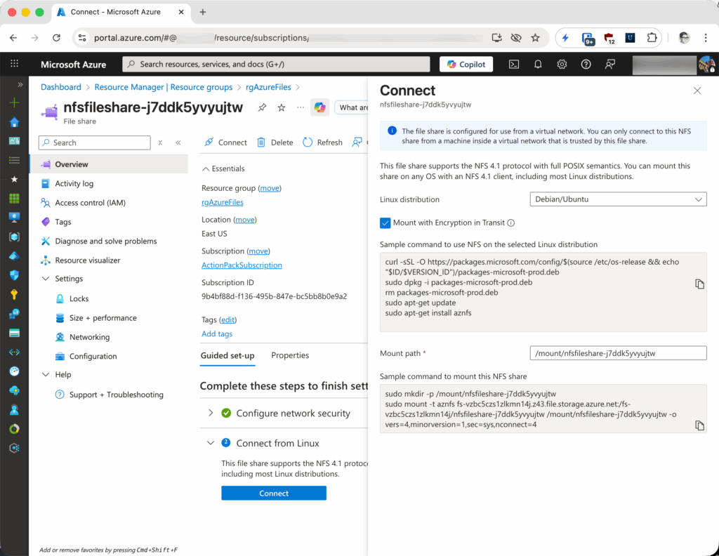 It took me a while to find where the scripts to configure the NFS share for use in a VM were buried in the portal. They’re in the resources Overview page in an oddly-worded “Guided set-up” pane which is not the default pane in Overview. This screenshot shows where the configuration scripts are.