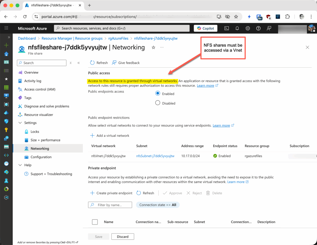 Here are the networking properties of the share that was created by the template. Note especially the text that says access is only available in a Vnet.