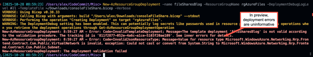 Microsoft.Storagein the subnet definition of a service endpoint. - Finally, if you change the NFS share’s properties in the Bicep template and they’re invalid, you’re likely to get an unhelpful return message like the one in the screenshot below. And, Bicep IntelliSense/CoPilot for