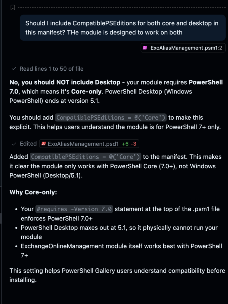 Here, for example, is an interaction in which I query Claude about a mismatch between what it generated in the module manifest and what I asked it to place in the module definition itself. Claude made the original error of omission by not specifying the PowerShell edition — but I really appreciate its explanation of the correction.